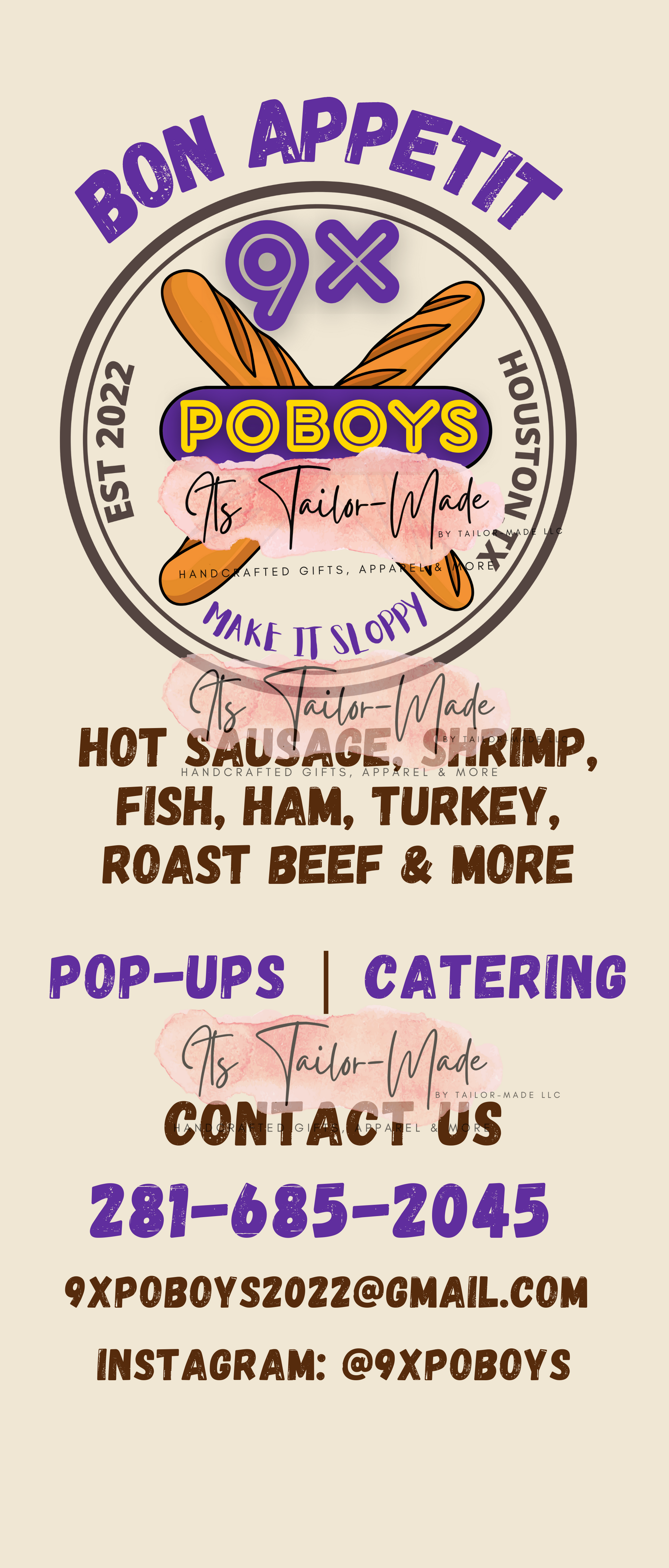 ATTENTION: This listing is for the authorized personnel of 9x Poboys & Catering. Any orders received from parties other than authorized personnel will be respectfully rejected. If you would like products specifically tailored for your business please contact us and we will be happy to assist. Thanks for choosing Its Tailor-Made by Tailor-Made LLC.